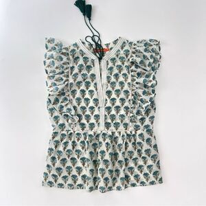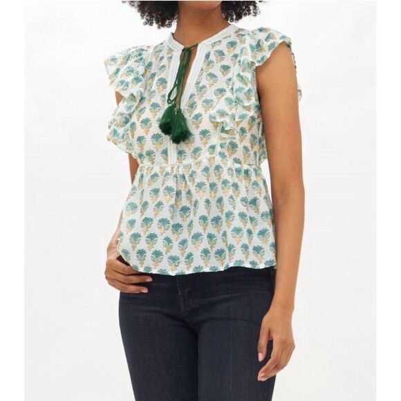 A versatile blouse that works from desk to dinner! Made from lightweight cotton Hand block printed with gold paint detailingHemstitch detailingStatement ruffle cap sleeves Tassel tie Model is 5'9" and is shown wearing a size SmallCare Instructions. Wash on a cold delicate cycle with gentle detergent.
