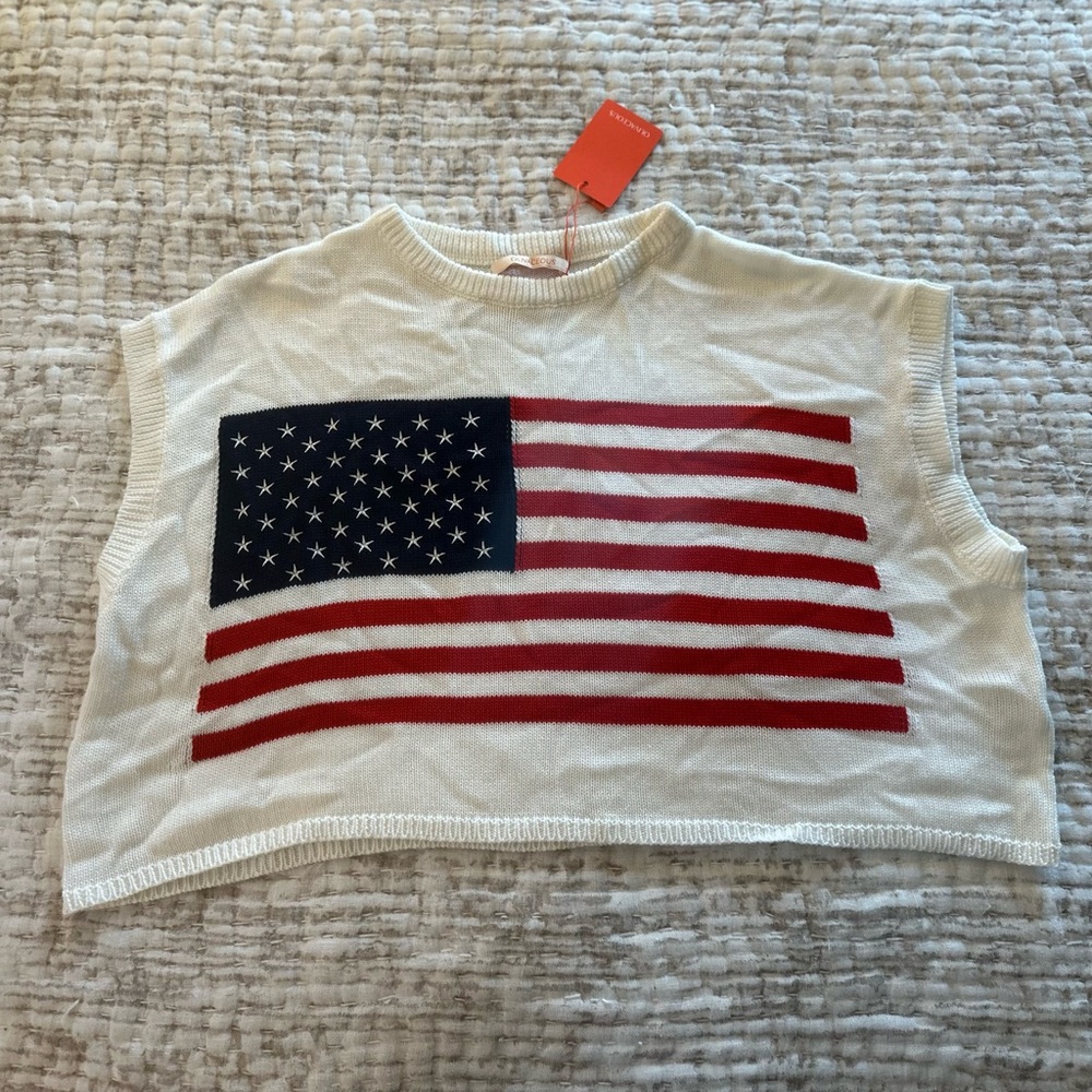 New super cute oversized crop Flag sweater top by OLIVACEOUS size S (width 25”, length 16”)