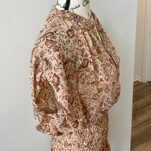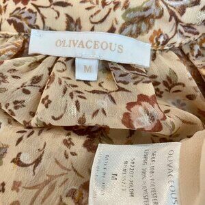 OLIVACEOUS DRESS FLORAL METALLIC DETAIL RUCHED TIERED SMOCKED SZ M FAIRY CORE