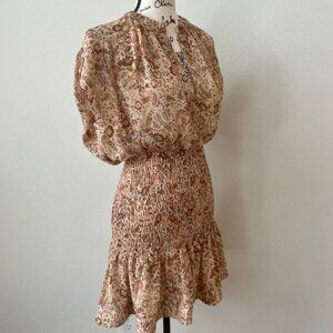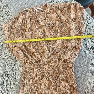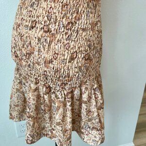 Step into bohemian elegance with the Olivaceous Mini Dress in a captivating flor tan color. Crafted for the free-spirited fashionista, this dress features shimmering metallic details that catch the light with every movement. The dress is designed with a flattering smocked waist that accentuates your silhouette, while the ruffle-tiered hem adds a playful touch. The lightweight material ensures comfort and breathability, making it perfect for warm weather occasions. Whether you're heading to a festival or a casual brunch, this size M dress effortlessly combines style and comfort, ensuring you stand out in any crowd. Excellent condition