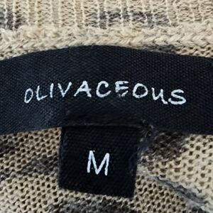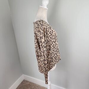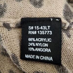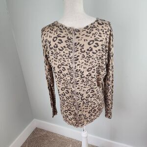 Olivaceous women's sweater top. Size medium. Leopard print. Long sleeve. Hi Low hem. Zipper Back closure. 66% acrylic. 24% nylon. 10% angora. Like new. No tears or stains.