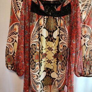NAME: OLIVE HILL SHEER DRAMATIC PRINT TOP, SIZE S, RELAXED, FRONT TIES, BOLD COLORS, LACE INLAY, HI/LO HEM, RED/NEUTRALS, 3/4 SLEEVES, ELASTIC CUFFS, BOHO, PERFECT FOR FALL AND UPCOMING SEASONS