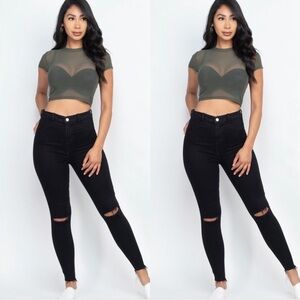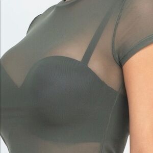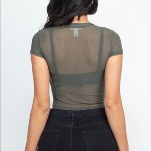 OLIVE SHORT SLEEVE CROPPED TOP SHEER MESH SHIRT