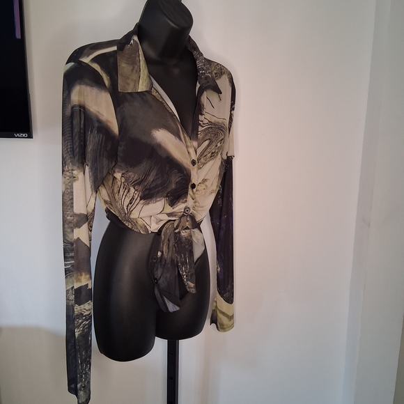 Elevate your wardrobe with this chic black and gray button-up top. Perfect for any occasion, this stylish piece offers a sophisticated look.