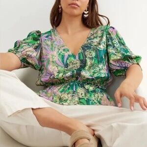 Bold in tropical tones, this summer blouse has a floral jacquard weave in green, pink and metallic gold hues. It's gathered at the waist, with a V-shaped neckline and voluminous puff sleeves. Pair with neutral trousers and gold jewellery to complete the look.