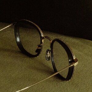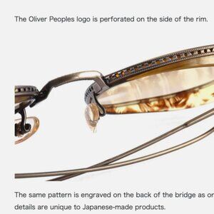 OLIVER PEOPLES TK-9 IS A TITANIUM, HANDMADE IN JAPAN OPTICAL FRAME. THIS PANTO LENS SHAPE IS DESIGNED WITH A UNIQUE ACETATE INSERT. FROM THE OUTWARD-FACING VIEW THE INSERT IS THIN AND FROM THE SIDE, THE ACETATE EXTENDS PAST THE EYEWIRE CREATING A SIDE SHIELD AESTHETIC. EXQUISTITE DETAILES COMPLETE THE STYLE INCLUDING A CUSTOM EYEWIRE WITH A PERFORATED REPEAT PATTERN OF THE OLIVER PEOPLES LOGO. THESE REFINED , VITAGE INSPIRED ELEMENTS PERFECTLY BALANCE THE MODERN FEEL OF THE TITANIUM PIECE .