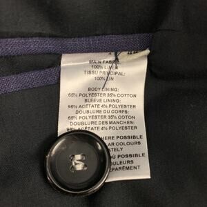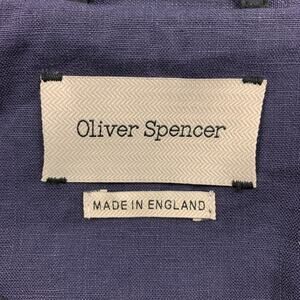 OLIVER SPENCER jacket comes in a blue linen with a full liner featuring white contrast stitching, front pocket, spread collar, and a full zip up closure. Made in England.