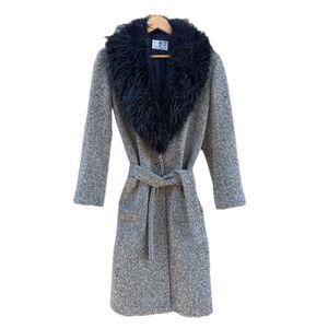 Keywords: tweed coat, faux fur collar, belted coat, herringbone, long coat, outerwear, winter fashion, elegant, sophisticated, classic, designer, Italian fashion