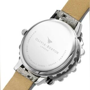 This dazzling OLIVIA BURTON women's watch is part of the charming Under the Sea collection. Crystals and shimmering faux pearls form a bubbling halo around a beautiful silver Sunray dial, paired with a silver glitter genuine leather strap and buckle clasp made of stainless steel. Recently purchased.