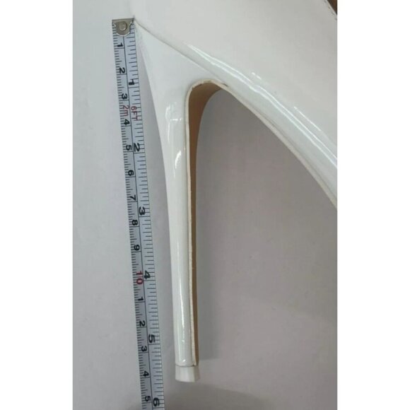 These elegant white stiletto heels elevate professional attire with their sleek patent leather finish and timeless peep-toe design, ideal for formal settings.