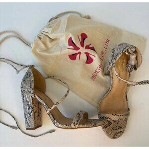 These sophisticated sandals feature a snake print design with lace-up straps. The block heel adds height and stability, making them a stylish choice for various settings.