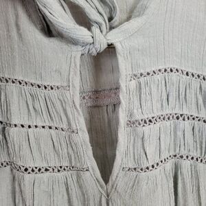 Soft Olive green, gauzy material with a crocheted design on the front, a tie, and ruffled short sleeves!!