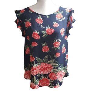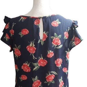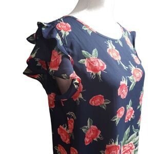 OLM Navy Res Roses Print Sheer Double Layer Ruffle Sleeves Sz M