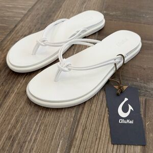 OLUKAI Aka Women’s sandals size 8. New with tags. White color. Give your feet optimal comfort at the beach wearing OluKai Aka Flip Flops. The toe-post thong features water-repellent synthetic upper and lining construction with polyurethane footbed.