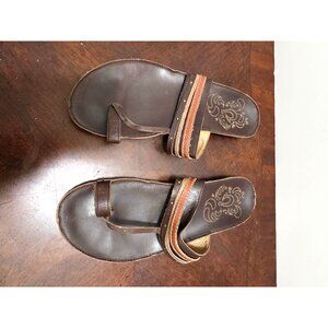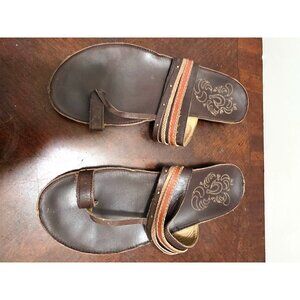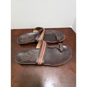 OLUKAI Women's Handcrafted Brown Leather Slip-On Sandals With Toe Loop & Embosse