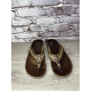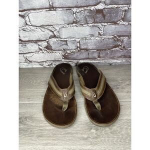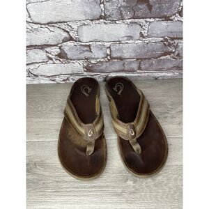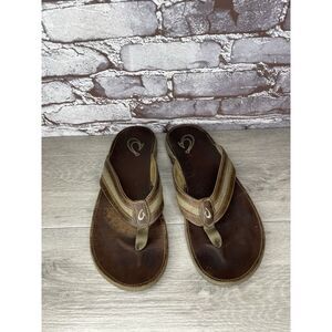 Selling OLUKAI Ikoi Brown Leather Synthetic Flip Flops Beach Thong Sandals Men Sz 12M US/45EU
