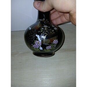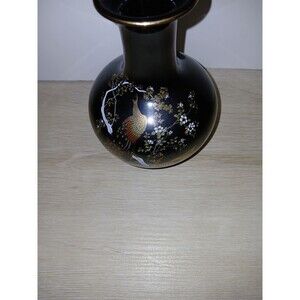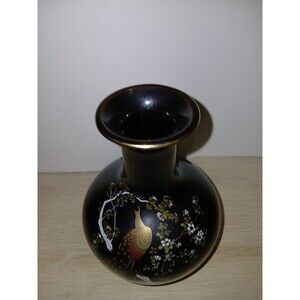 This vintage OMC vase from Japan features hand-painted peacocks on its surface, accented by a gold rim. The vase has a height of 6 inches and a base diameter of 14 inches, making it a unique and eye-catching piece for any home decor. Handmade in Japan, this vase showcases traditional Japanese craftsmanship and design, reflecting the culture and artistry of the country. Perfect for collectors of Asian art or those looking to add a touch of elegance to their living space.