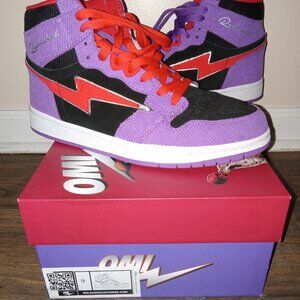 The ORIGINAL/ 1st Gen design of OMI Reloaded before the lawsuit. The OMI Reloaded Size 9 Toronto Raptors shoe is a stylish and unique pair of sneakers that captures the spirit of the Toronto Raptors basketball team. These shoes are characterized by their bold design, featuring the team's colors, purple, red and black. Shoes are in excellent condition, only being worn once and comes with shoe bag and laces.