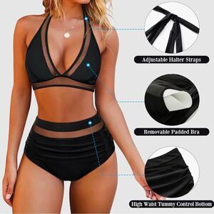 OMKAGI Mesh High Waisted Bikini Set V Neck Tummy Control Size M