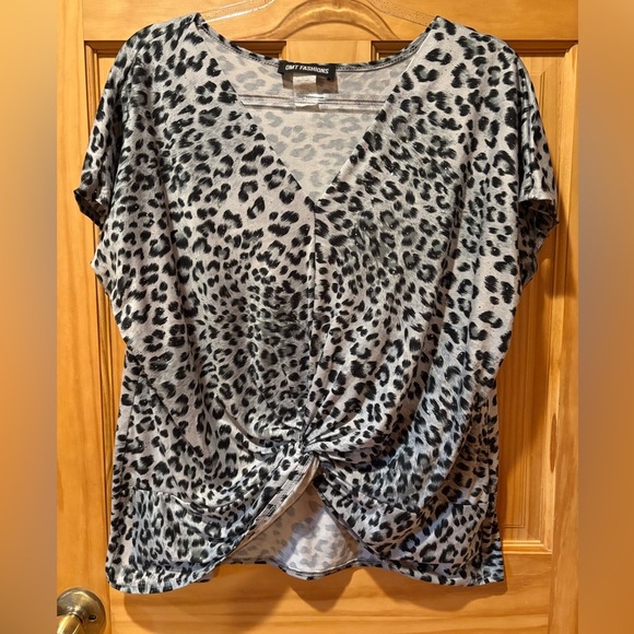 OMT Fashions, women’s size 2X, featuring an animal print with subtle sparkles. This top has a V-neckline and a knotted detail at the front hem, creating a stylish twist. This chic top features a trendy leopard pattern, perfect for any occasion. Good condition. See measurements to insure that this is the correct fit for you Any questions leave in comments
