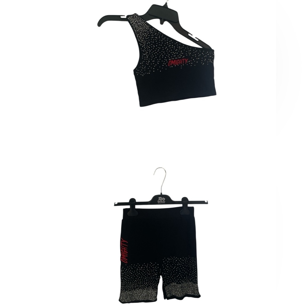 Rhinestone matching set, featuring unique and eye-catching design. One shoulder top and fitted bottoms.