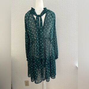 Chic green dress with floral design. Features a stylish ruffled neckline.