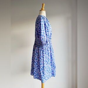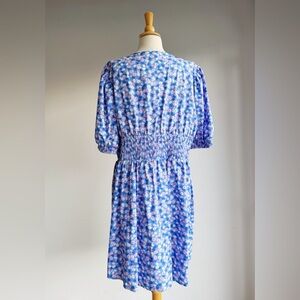 "Pretty ditsy-print cotton blooms anew with the exposed front zip and wide smocked waist of this puff-sleeve dress from On 34th."