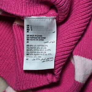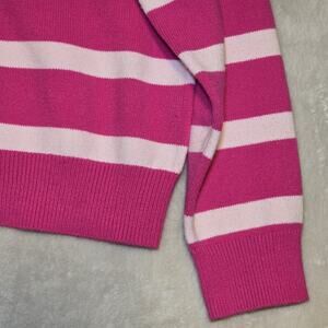 Trendy ON 34th women’s half-zip striped sweater in size Large. Features bold fuchsia pink with light pink stripes, wide collar, and ribbed cuffs/hem. Lightweight cotton blend is soft and comfortable — perfect for casual everyday wear or layering.