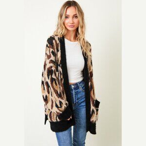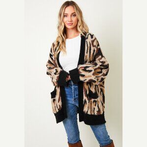 Leopard print cardigan with black trim, oversized fit, and open front design. Features bold animal print in beige, brown, and black tones. Made for layering over crop tops, tees, or long sleeves. Includes front pockets and ribbed cuffs. Ideal for fall and winter casual wear. Pairs well with jeans and boots for a cozy streetwear look. Available in S, M, L.