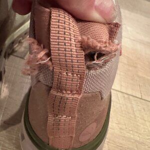 The product is a pair of ON CLOUD women's pink hiking boots in size 8. These athletic sneakers are designed for outdoor activities, featuring a comfortable and supportive fit. The pink color adds a stylish touch to the practical and durable design of the boots, making them perfect for hiking and other outdoor adventures. The ON CLOUD brand reputation ensures quality and performance in these versatile hiking boots for women. Shoes have lots of wear left- overall good condition - the back has tearing from pulling the shoes on.