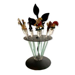 If you like a little twee with your martini you'll go crazy for this midcentury West German set. There are twelve stirrers in total, housed in a figural holder made to look like a plant growing out of a pot. The leaves double as the handle. The theme here seems to be "German fairytales" but also includes some circus and animal imagery. In this set we have: