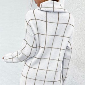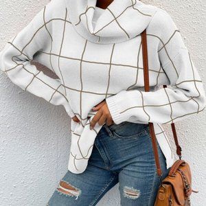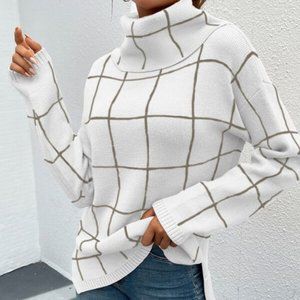 Grid Pattern Turtleneck Drop Shoulder Sweater