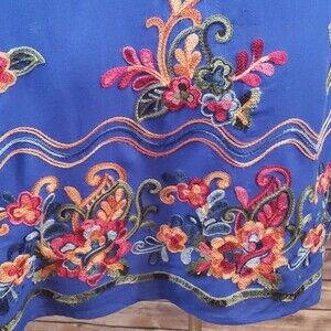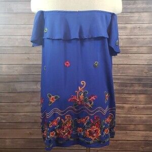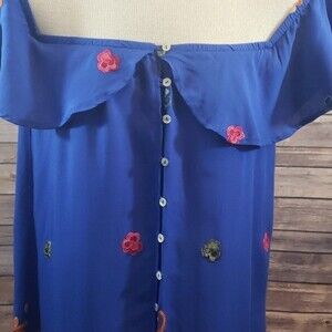 New On The Road Anthropologie floral embroidered off shoulder dress tunic size medium. Bright blue with bright colorful floral embroidery. Button down front with off shoulder ruffle around top.