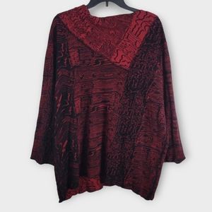 Red and black crinkled texture long sleeve sweater with dramatic split cowl neck. Authentic lagenlook art-to-wear piece.