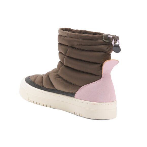 puffer style, pull on loop, traction sole, drawcord detail, tote bag included