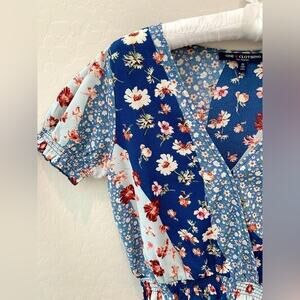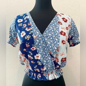 ONE CLOTHING Blue Mixed Floral Patchwork Top Smocked Waist Cropped!