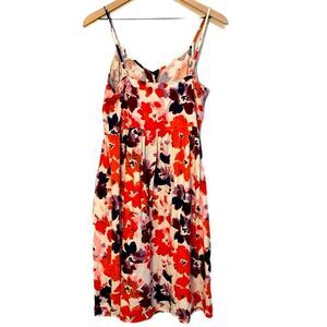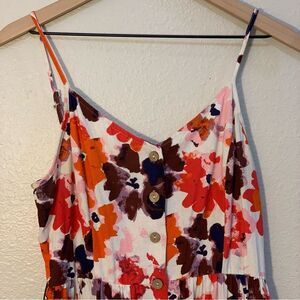 This stylish sundress from One Clothing showcases a vibrant floral pattern in orange and purple, perfect for resort wear. The sleeveless design with spaghetti straps and a v-neckline offers a chic and breezy look. Its midi length ensures a comfortable fit for sunny days.