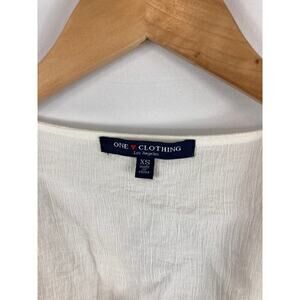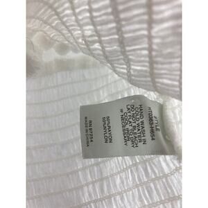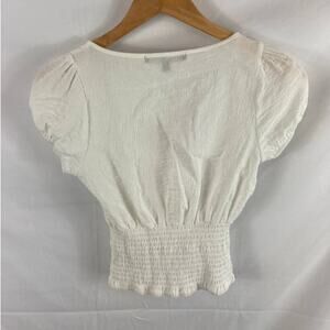 A flowery neckline appliqué tops this sweet and sassy, cap-sleeve top featuring waistline smocking for a flirty and flattering fit.