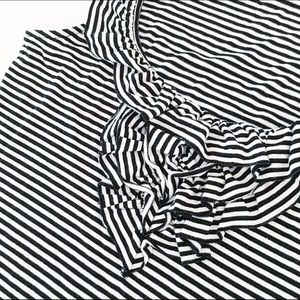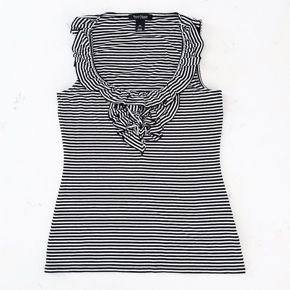 << White House Black Market Stripe Sleeveless Top! >> This stretchy and soft top features a cute, classy ruffle neckline and a flattering cut! Great condition - only worn a few times! ๐