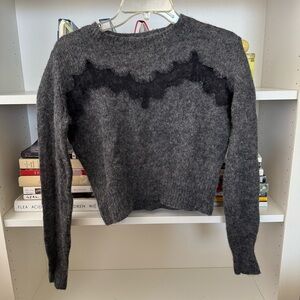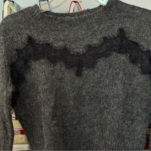 33% superfine alpaca, 32% superfine merino wool, 35% polyamide. Hand wash cold. Lightweight knit fabric. Lace trim. Shoulder strap accents.Revolve Style No. ONEG-WK133. Manufacturer Style No. 40OGD802. Size small. Good preloved condition