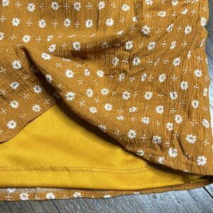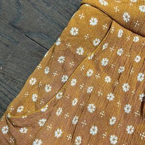 Turmeric Gold & White Geometric Floral Print Crinkle Rayon Gauze Button Front Shorts Romper One Heart Clothing