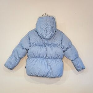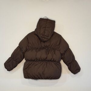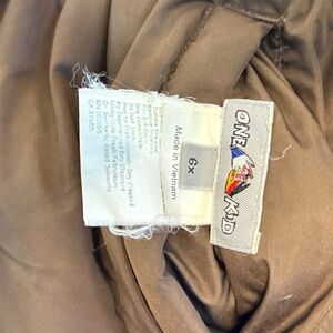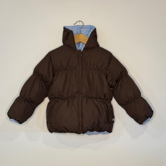 Fully reversible down puffer jacket by One Kid in chocolate and baby blue. Unisex. Child Size 6X.