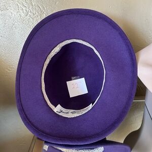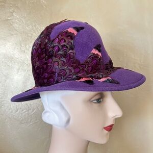 ONE OF A KIND DESIGNER JACK MCCONNELL VINTAGE PURPLE FELT HAT + FEATHER DETAILS