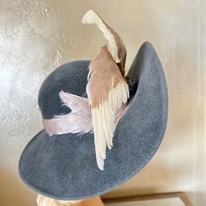 ONE OF A KIND JACK MCCONNELL WIDE BRIM GRAY FELT HAT + LARGE FEATHER WINGS