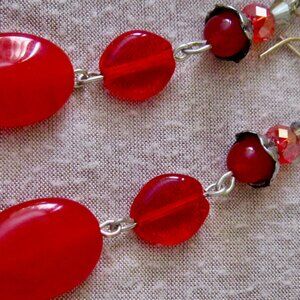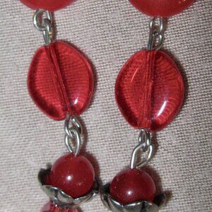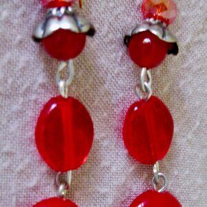 HERE'S A GREAT PAIR OF RED VINTAGE BEADS PIERCED EARRINGS WITH SILVER TONE EAR WIRES... Like buying from a local designer? T. Burke Designs has been designing and selling her vintage glass beads and crystals for 40 years. Do you have someone on your holiday gift list (or for yourself) who would love these? Her collection of vintage beads, crystals and jewelry findings began many decades before and she savors the fine pieces looking for ways to create sales we can all live with. These measure 3" long and have silver tone ear wires. The lucky buyer will receive these in a Free gift box (while supplies last) and go out in the mail the day after the purchase is received. Interested? Just buy now and you'll be enjoying these soon.