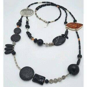 Long multi-strand asymmetrical statement necklace made of sterling silver, onyx, amber, and lava beads incorporating different shapes, sizes, and textures