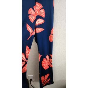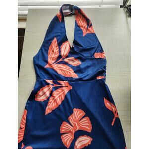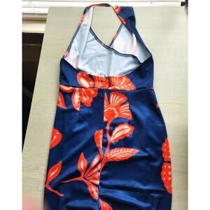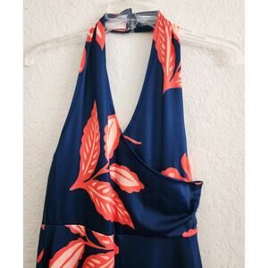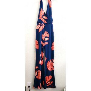 This is a throwback jumpsuit. It is a halter top with two buttons at the back neck. It has long flared legs. It is a polyester fabric that is soft and shiny. It is a dark blue with orange floral. It has a Y2K or even 1960's-1970's style. This is marked as Small, but it is definitely an X-tra Small. It is a very tiny looking fit.