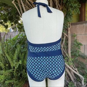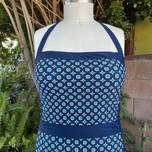 Jaclyn Smith collection. Square neck line with halter tie at back. Navy blue with royal/white design. Preowned condition with snags on the seat, see last photo. Ships same/next day. Smoke-free home.