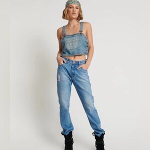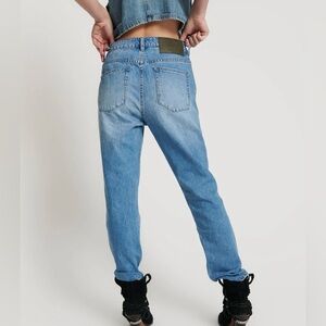 Slouchy, relaxed fit with distressing throughout. Excellent pre-owned condition, no flaws.