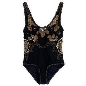 This luxurious bodysuit from One Teaspoon features a striking black base adorned with intricate antique gold sequined embellishments in a baroque-style pattern. The scoop neckline and tank-style straps add a classic touch, making it a standout piece for any occasion.